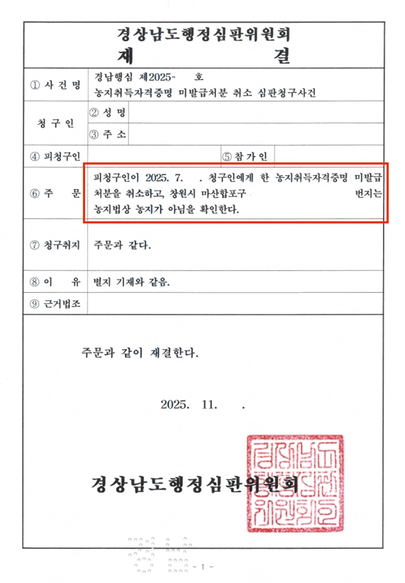 * 농지취득자격증명 미발급 처분에 대한 행정심판 인용 사례